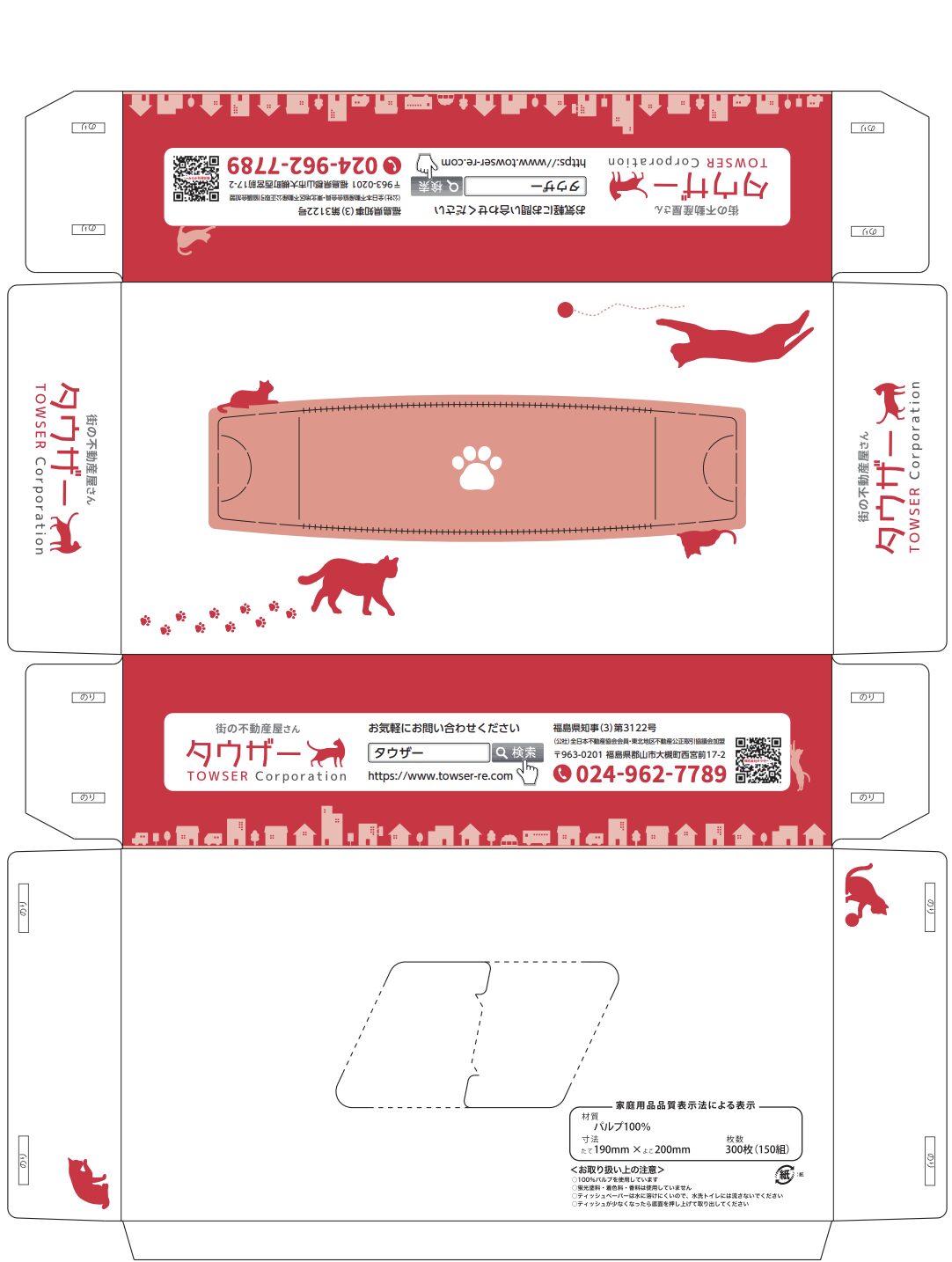 来客されたお客様、業者さんへの挨拶まわりに使えるノベルティとして、オリジナルティッシュBOXを作りたいとのご相談で当社にてデザインから製作までお任せいただきました。
